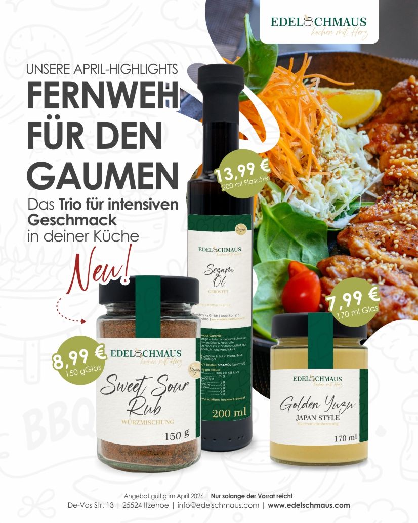 Unser neues Sweet Sour Rub bringt die perfekte Balance aus fruchtiger Süße und feiner Säure in deine Küche. Zusammen mit unserem Sesam Öl aus gerösteten Sesam und unserem neuen Golden Yuzu mit seiner feinen Schärfe von Meerrettich und der fruchtig-frischen Note der Yuzu verleiht es Deinen Gerichten einen unverwechselbaren Geschmack.